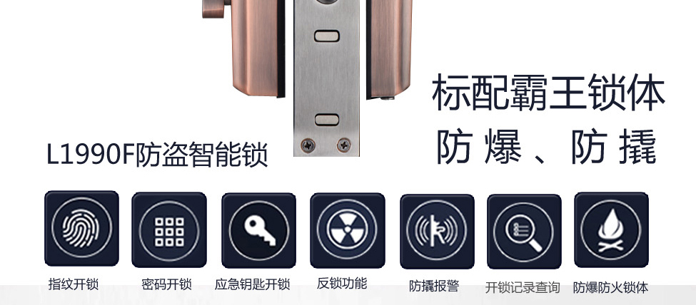 L1990F防盜智能鎖標(biāo)配霸王鎖體防爆、防撬指紋開鎖、密碼開鎖、應(yīng)急鑰匙開鎖、反鎖功能、防撬報(bào)警、開鎖記錄查詢、防爆防火鎖體