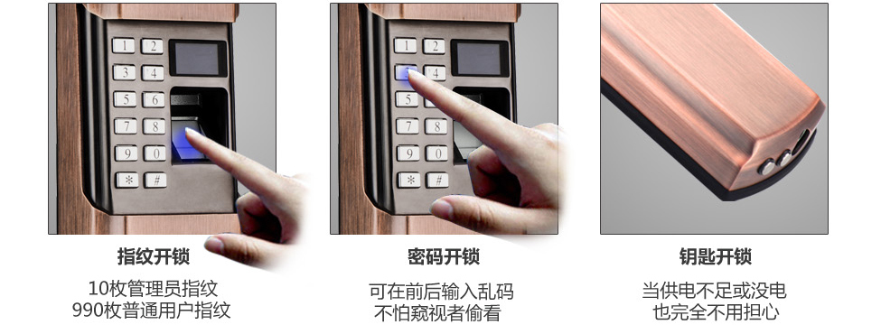 智能鑰匙容量:卡/密碼200組;指紋1000枚