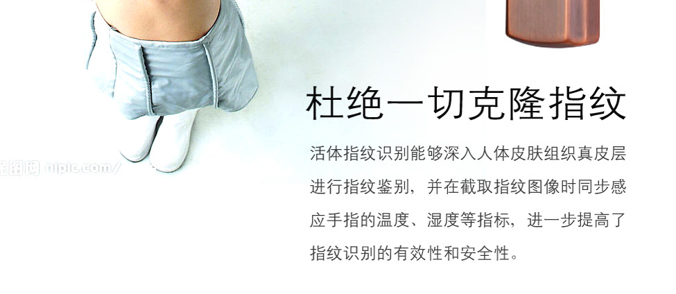 杜絕一切克隆指紋:活體指紋識別能夠深入人體皮膚組織真皮層進(jìn)行指紋鑒別,并在截取指紋圖像時(shí)同步感應(yīng)手指的溫度、濕度等指標(biāo),進(jìn)一步提高了指紋識別的有效性和安全性。