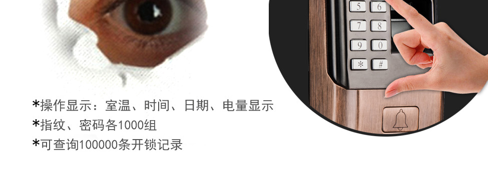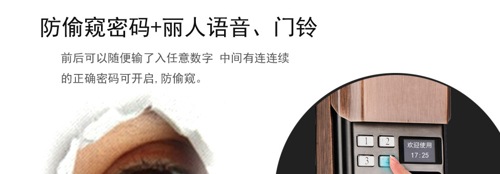 防偷窺密碼+麗人語音、門鈴:前后可以隨便輸入任意數(shù)字,中間有連續(xù)的正確密碼可開啟,防偷窺。
