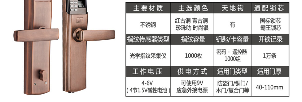 L1990F紅古銅指紋密碼鎖技術(shù)參數(shù):
