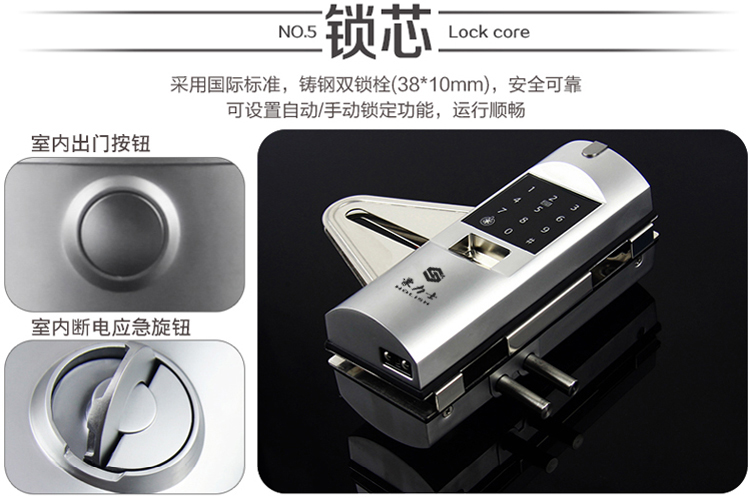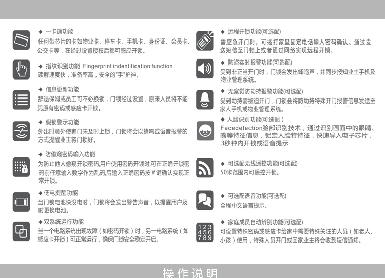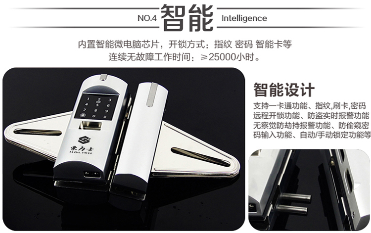 內置智能微電腦芯片,支持一卡通功能、指紋、密碼、刷卡、遠程開鎖功能、防盜實時報警功能、無察覺防劫持報警功能、防偷窺密碼輸入功能、自動/手動鎖定功能等,連續無故障工作時間:≥25000小時。