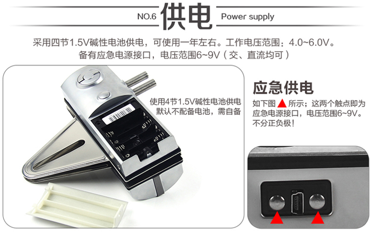 采用四節1.5V堿性電池供電,可使用一年左右。工作電壓范圍:4.0-6.0V。具有備用應急電源接口,電壓范圍6-9V。